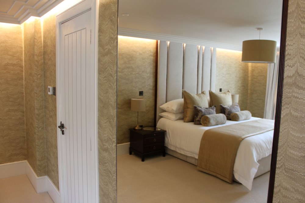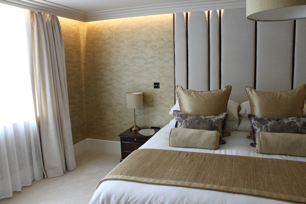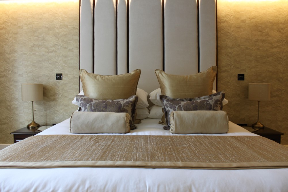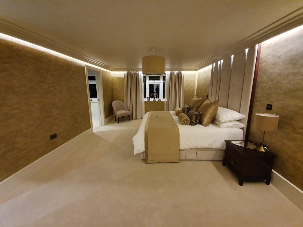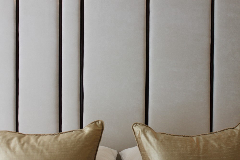 The client contacted us for a bespoke headboard when they came to redesign the bedroom in their Master Suite.  They wished to create a feel for a dropped ceiling, while looking to avoid the difficulties of retrospective structural work in their furnished home; ceiling-bonded coving with a cavity left for an LED strip created this effect.  As a result, the headboard needed to be a specific height for the room, and a depth that would work with this coving concept.