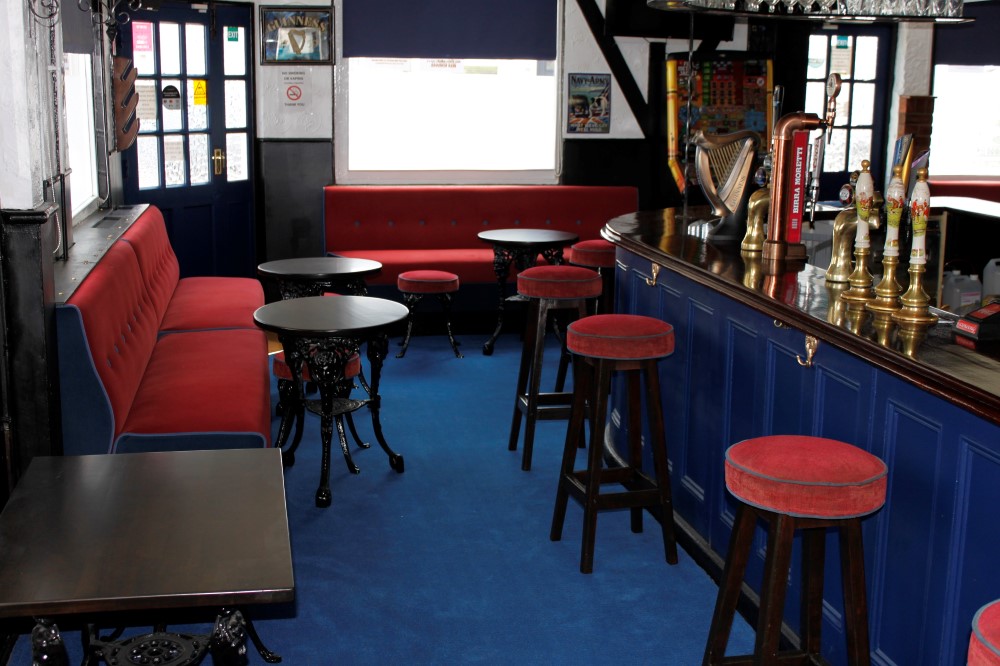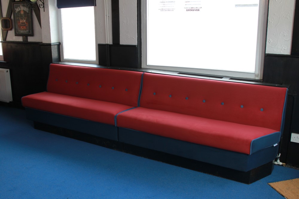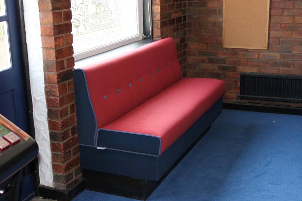 Well acquainted with the necessary properties of seat fabric in the restaurant/pub setting, we proposed a range of durable, wipeable fabrics. The client’s choice was a wipeable velour – a practical yet luxurious-looking finish. At this point it was also mutually agreed to use a contrasting colour for the piping and buttons within the seating, injecting some colour and life to the pub’s atmosphere. Ensuring re-fitting of the benches worked within the renovation schedule, we put the seating back as it was – yet significantly improved both in aesthetics and comfort.