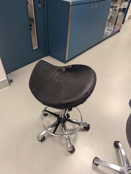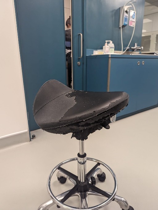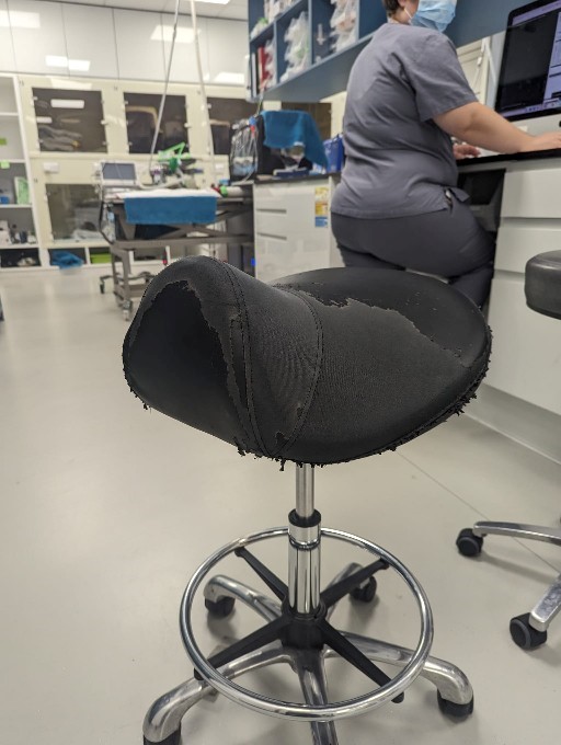 These online purchased stools had a cheap vinyl covering which corrupted with the use of sterilisation disinfectants. So the dilemma was to either throw away and buy again and have the same thing happen again or to upgrade and recover in a quality vinyl with an Acryltron coating to resist the disinfectants.