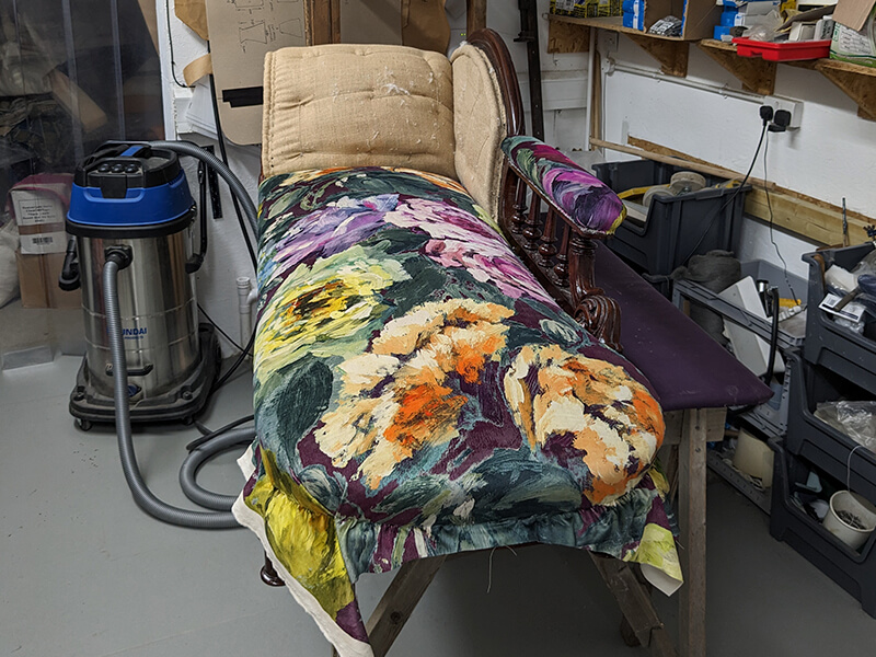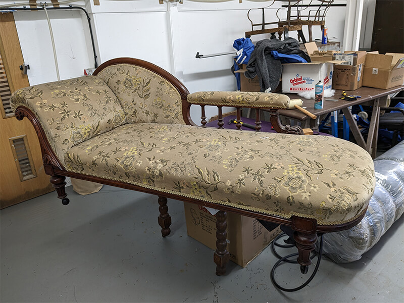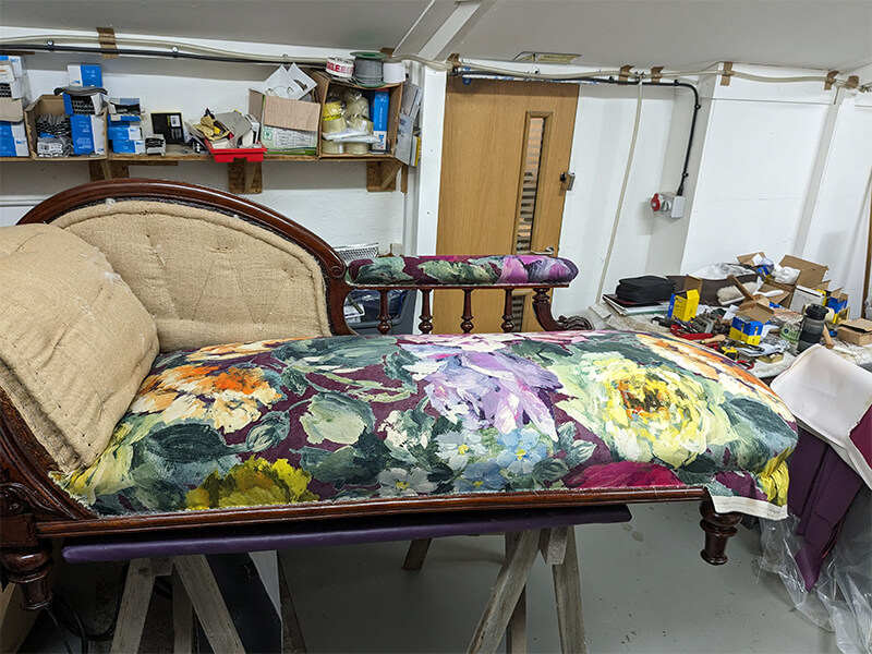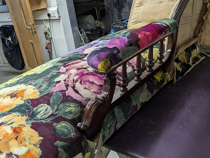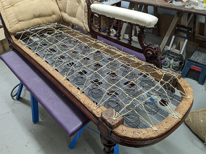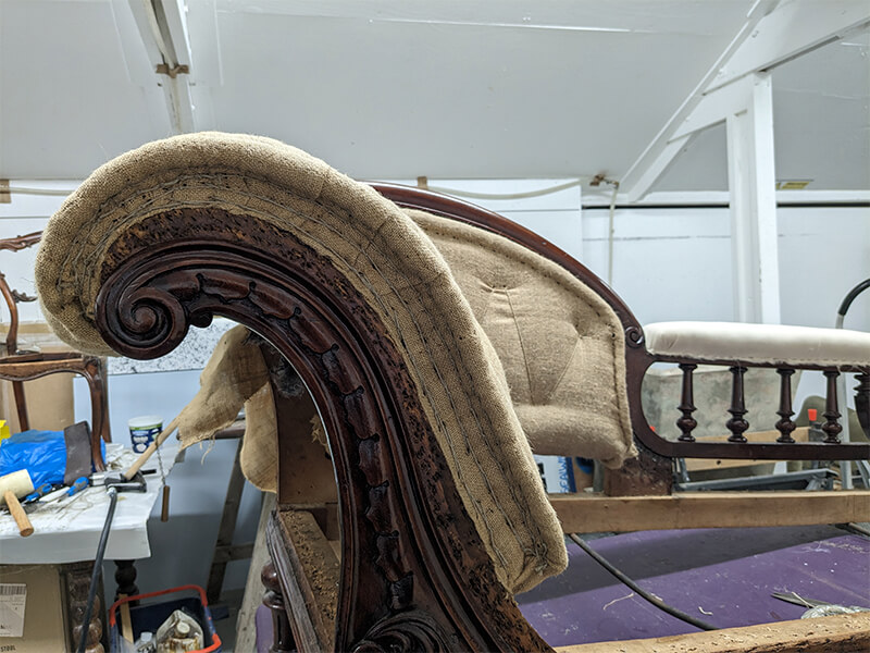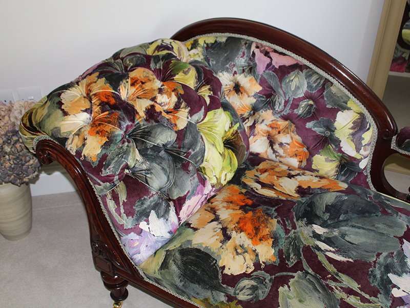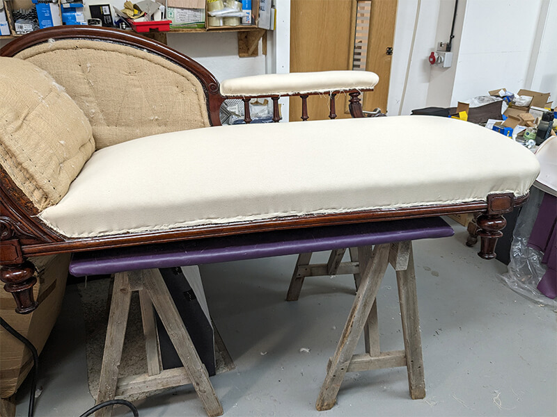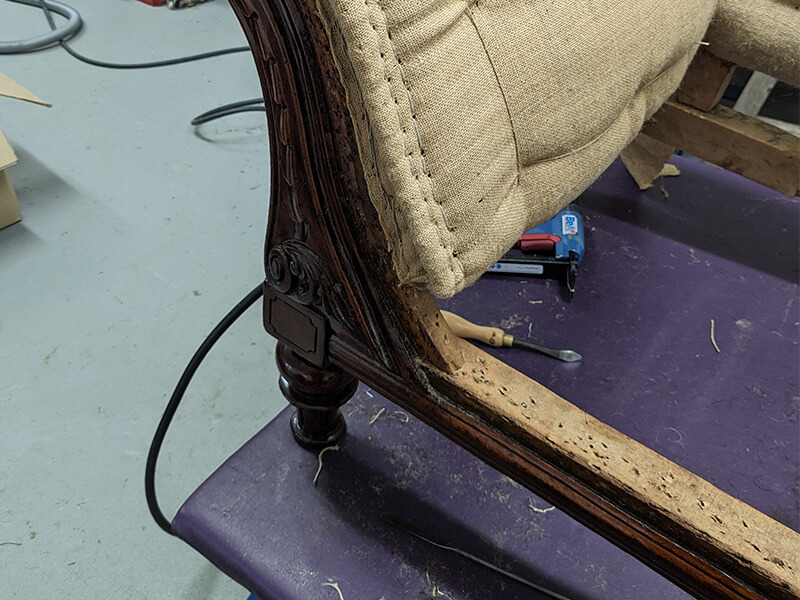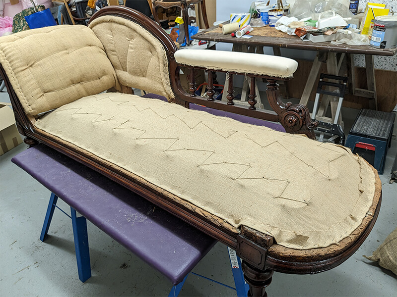 We were commissioned to restore this chaise to its original status. We found that the original horsehair had been removed from the piece and replaced with an inferior Coconut fibre filling. The buttoning had all been removed for ease of reupholstery and the cheapest of webbings and hessians had been used underneath. Even the brass castors had been changed for modern easy-roll types. So all and told, a very inferior job.