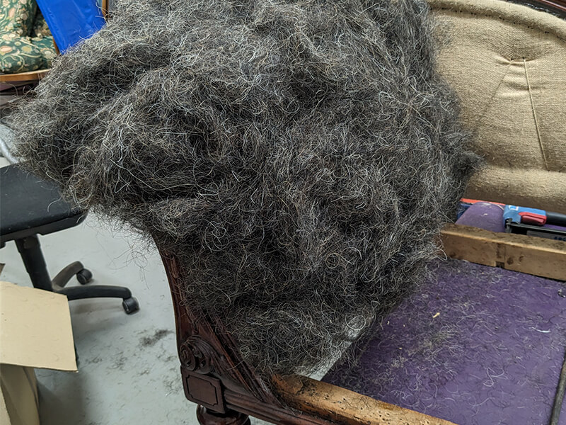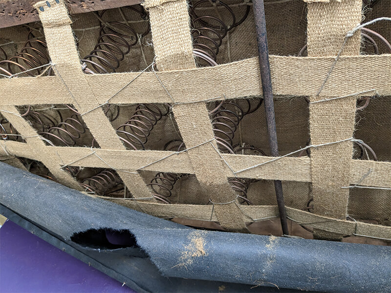 So we set to and restored it to its former glory. We rebuilt it using the best Black & white webbing, 15oz Tarpaulin hessian over the springs, Long Tail horsehair filling , all stitched in under 12oz hessian for lasting strength and durability. Then over the stitching, we used more horsehair, 100% lambswool felts and denim calico. Between the calico and the final velvet we used a wool barrier cloth to protect the velvet. We re-designed the buttoning pattern in the scroll back and side arm panel. Now the couch is good for use until at least 2124.